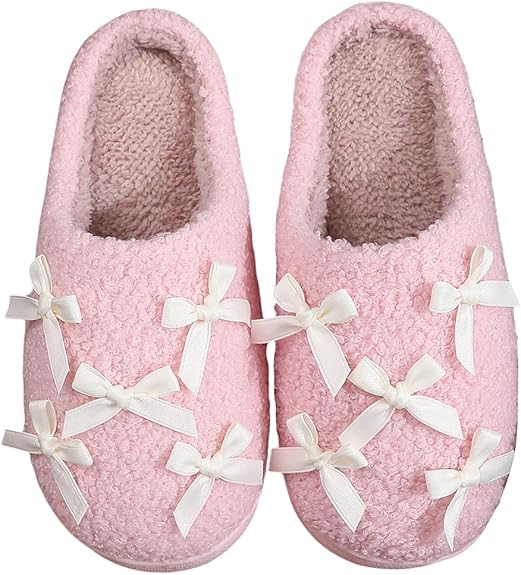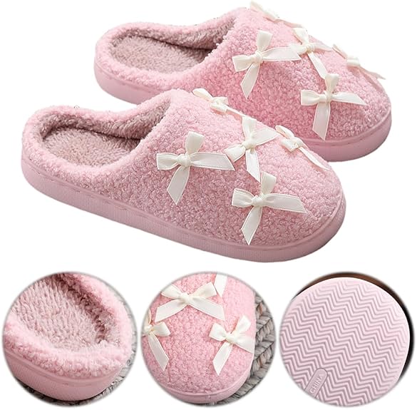 Women Bow Slippers Cute Plush Fluffy Warm Fur Slippers Comfy House Slippers for Indoor House Home Winter