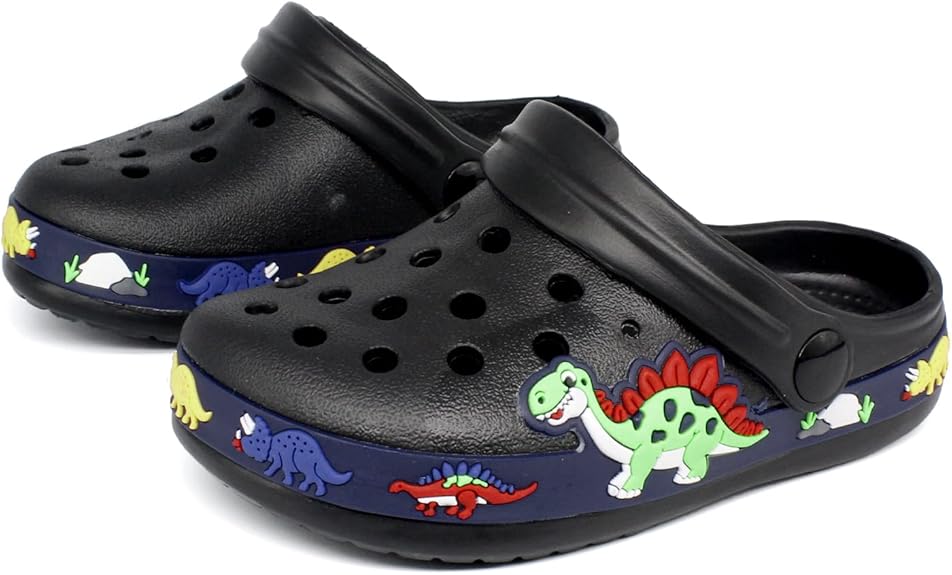 Kids Clogs:Ultra-light EVA.Synthetic sole.Cute excavator dinosaur and unicorn cartoon designs for boys and girls.Sizes for ages approximately 2 to 9 years old.